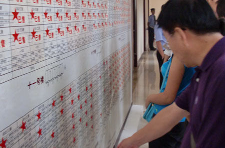 上周末,北京楼市供应和销售量有所降温。图为北京风景售楼处一看房人在销控板前思考。